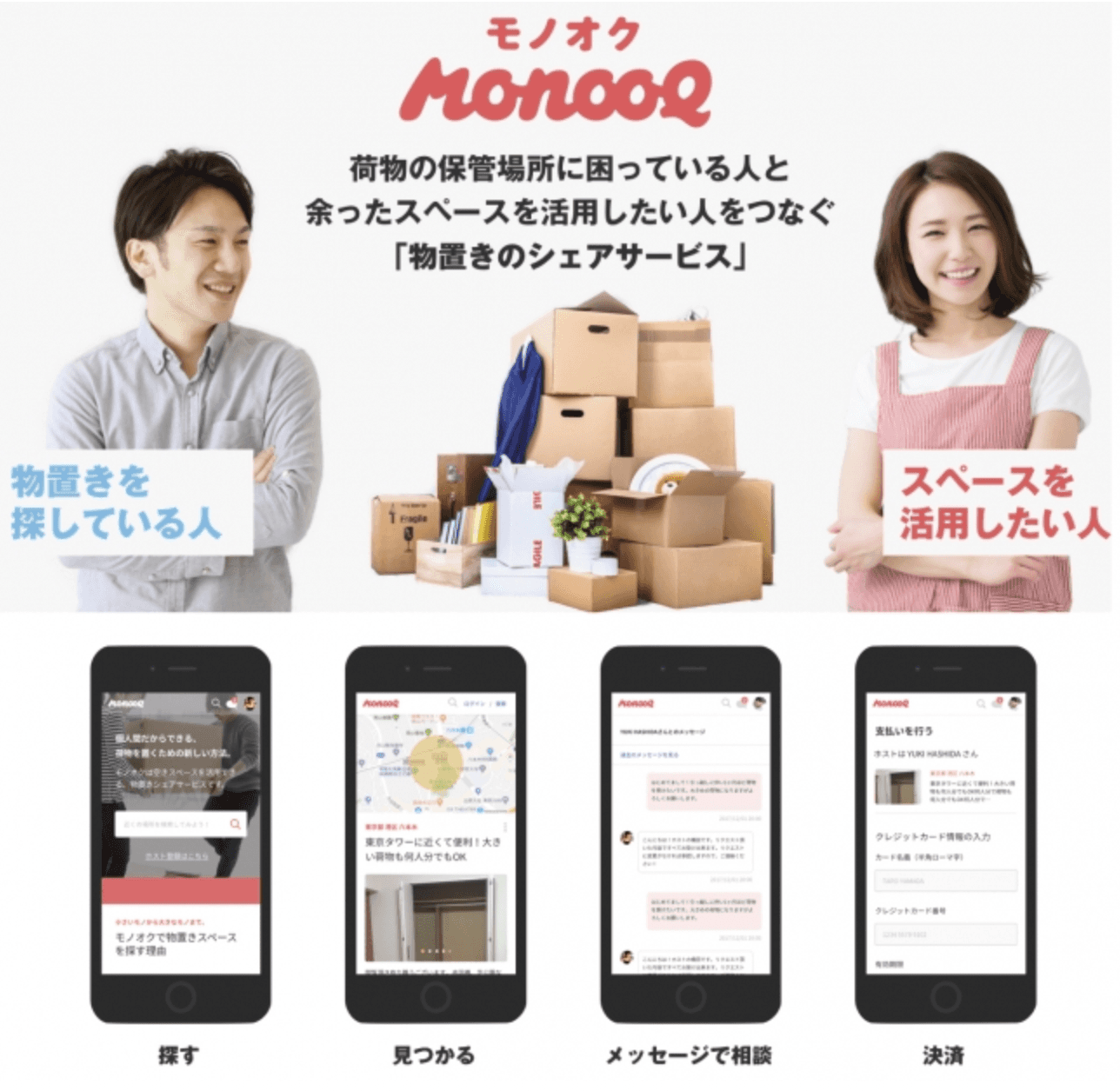 荷物を預けたい人と、使っていない部屋や倉庫などの空いたスペースを活用して荷物を預かりたい人をマッチングする個人間の物置シェアリングサービス。 場所、保管期間、予算など、自分の条件にあったスペースを探し、荷物を預けることができる。公式サイト:https://monooq.com/