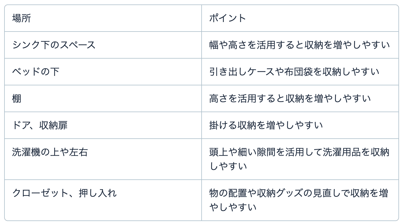 デッドスペースになりやすい場所や収納作りに活用できるアイテムをチェックして、自宅の収納を少しずつ増やしてみましょう。