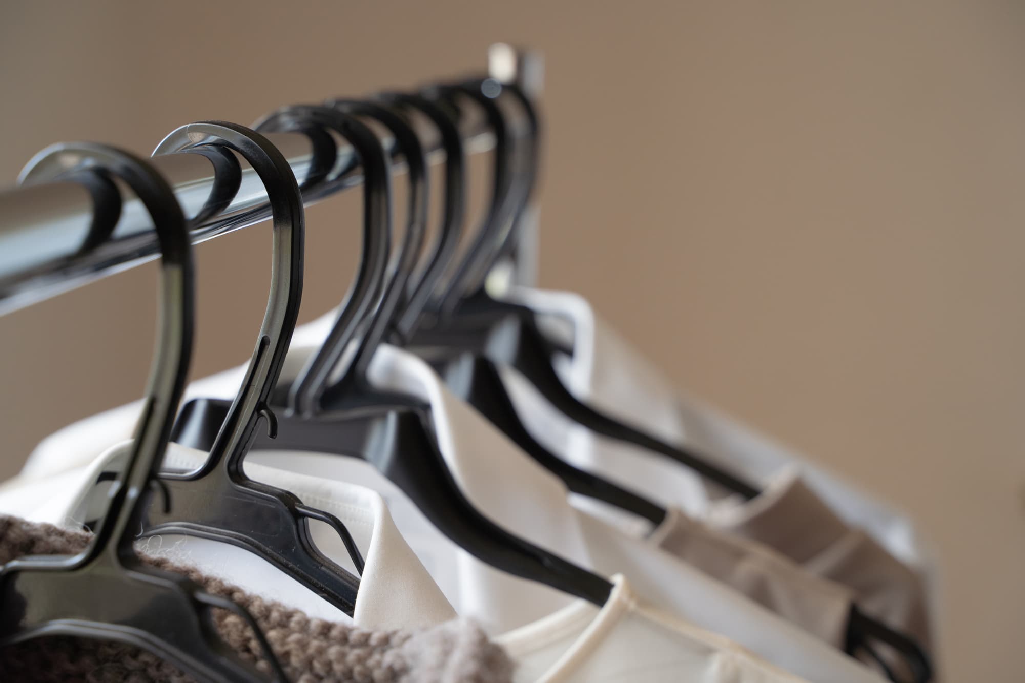 ハンガーの洋服は丈をそろえて並べることで下にまとまった隙間ができ、スペースを活用しやすくなります。