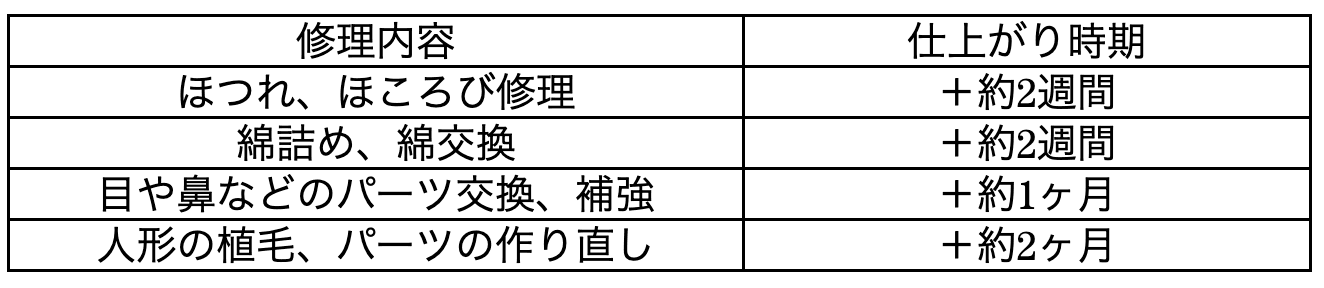 クリーニングのみの場合に比べて仕上がりまでの期間は延びますが、修理が必要な古いぬいぐるみをキレイにしたい場合はクリーニングとセットで依頼するのがおすすめです。